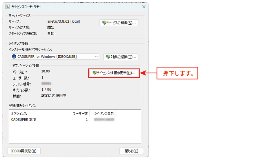ライセンスユーティリティ内の『ライセンス情報の更新』ボタンを押下し、『ライセンス情報の更新』画面を表示します。