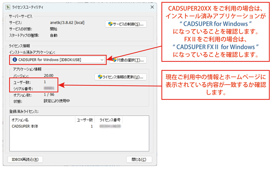 画面のシリアル番号(下5桁)・ユーザー数がホームページに表示されているシリアル番号・ユーザー数と同じであることを確認して下さい。