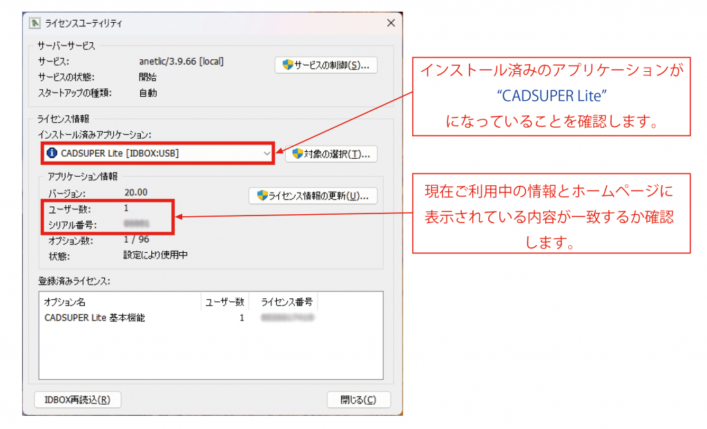 画面のシリアル番号(下5桁)・ユーザー数がホームページに表示されているシリアル番号・ユーザー数と同じであることを確認して下さい。
