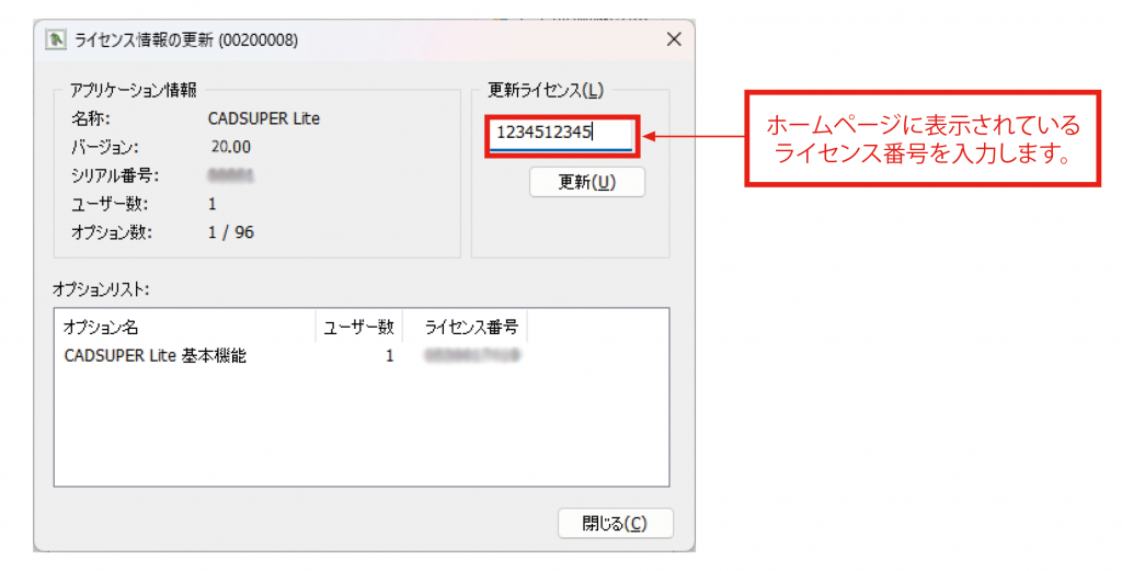 ホームページに表示されているライセンス番号を入力してください。