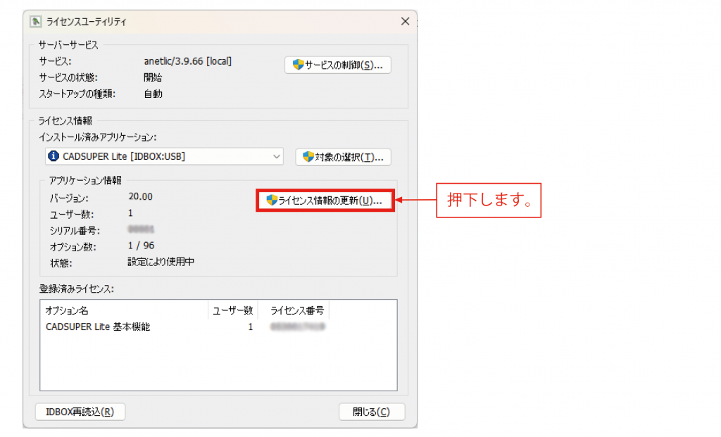 ライセンスユーティリティ内の『ライセンス情報の更新』ボタンを押下し、『ライセンス情報の更新』画面を表示します。