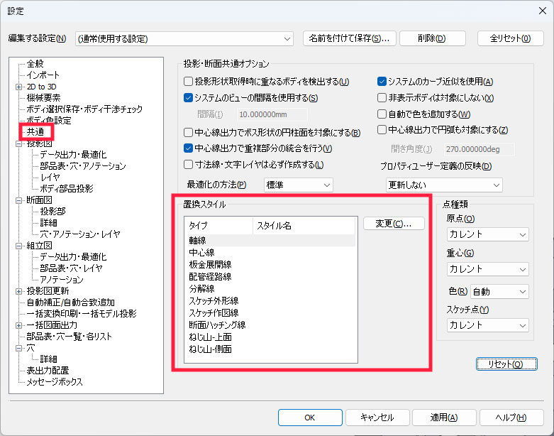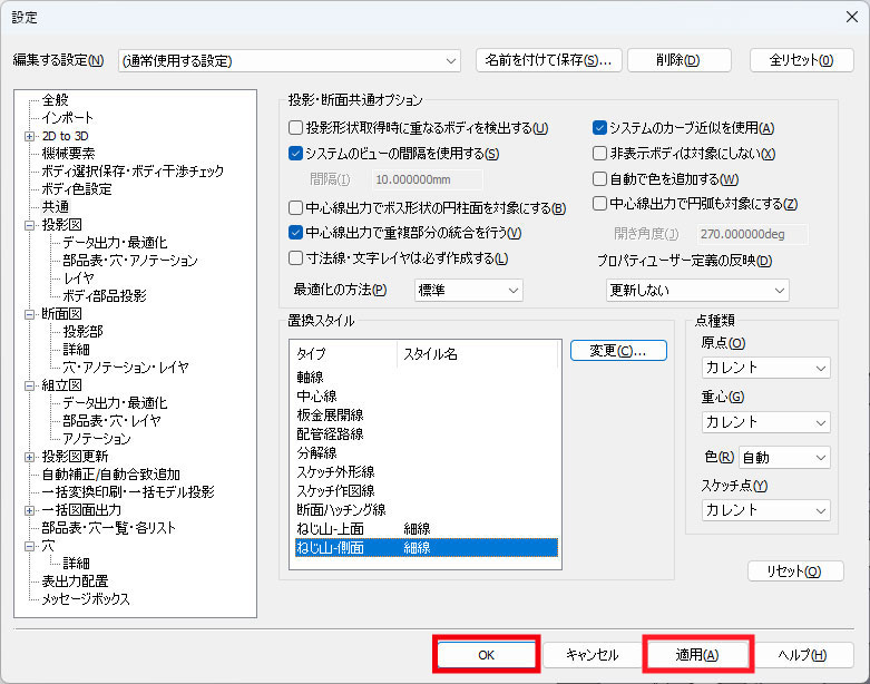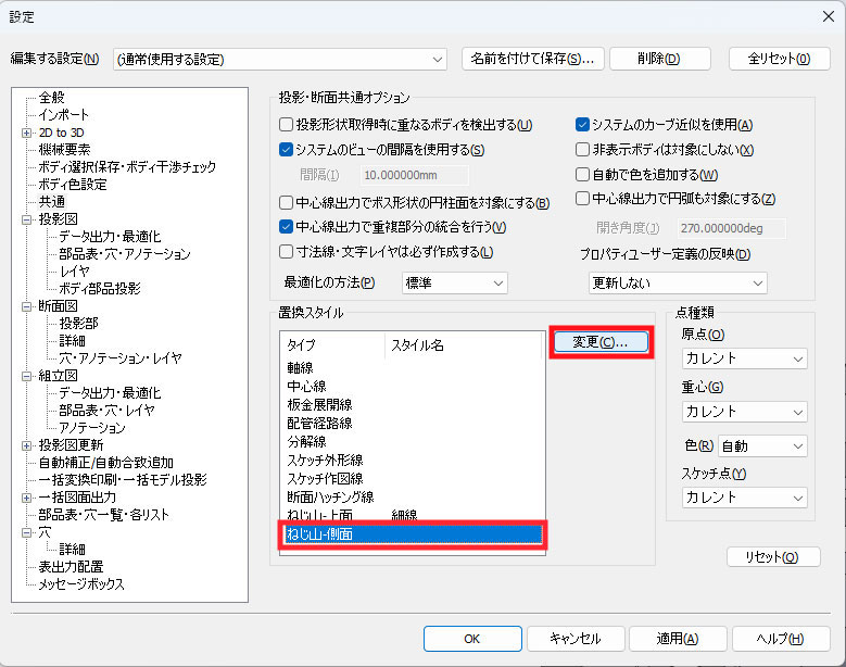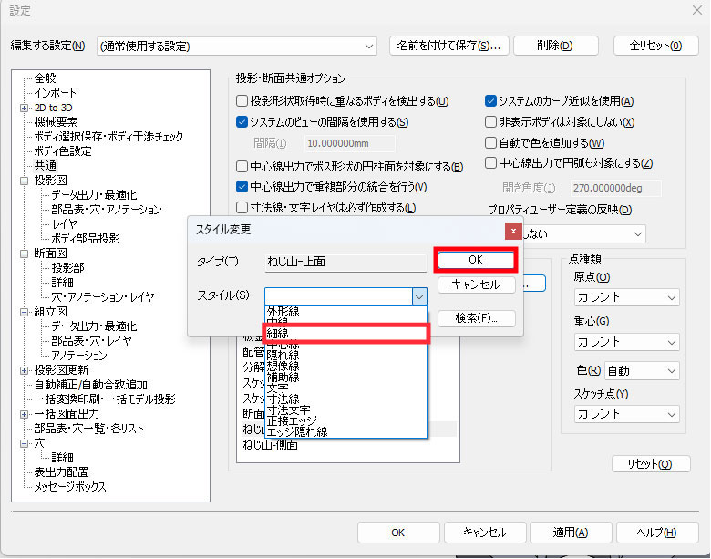 投影図出力時の線のスタイル登録方法
