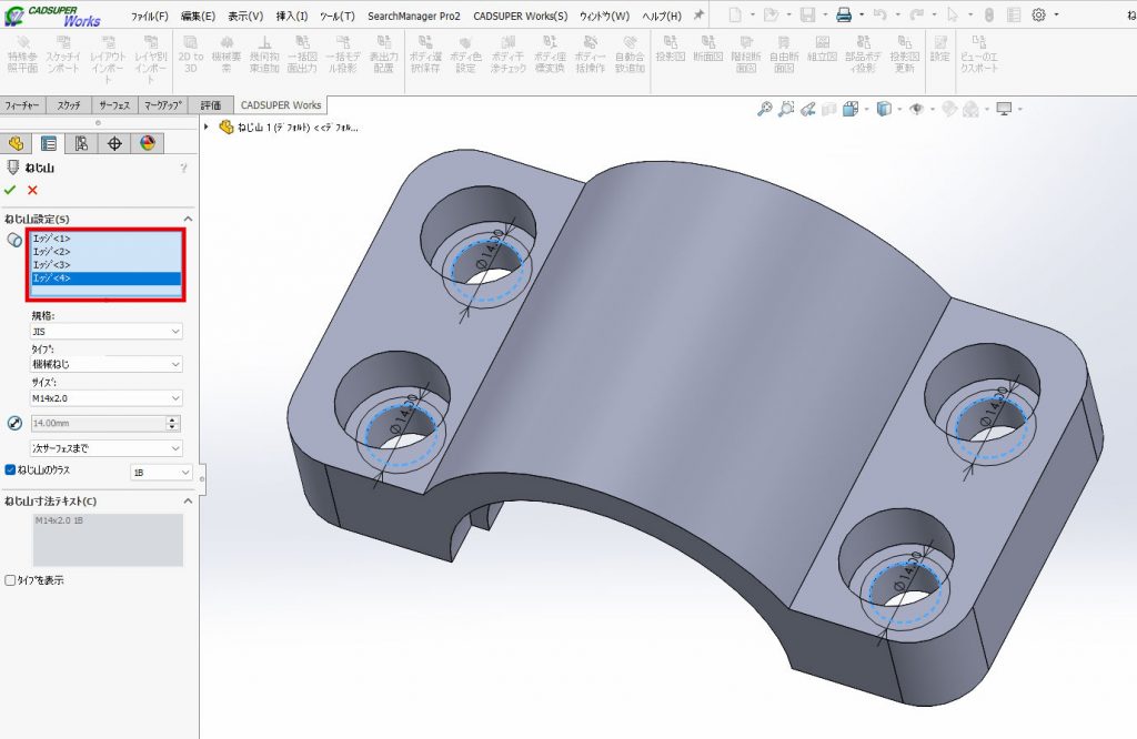 ②ねじ山の円のエッジをクリックし、ねじ山設定を行います。