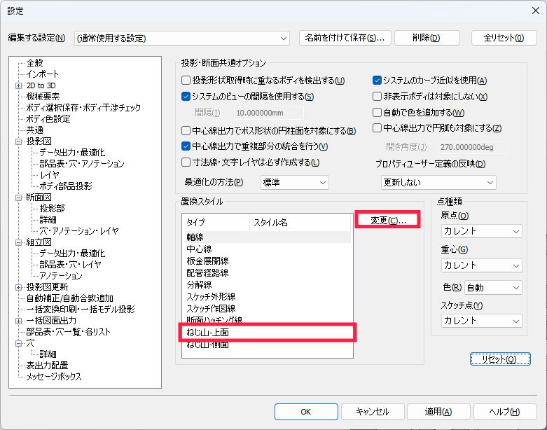 ②「共通ー置換スタイル」から、ねじ山タイプの設定を行います。