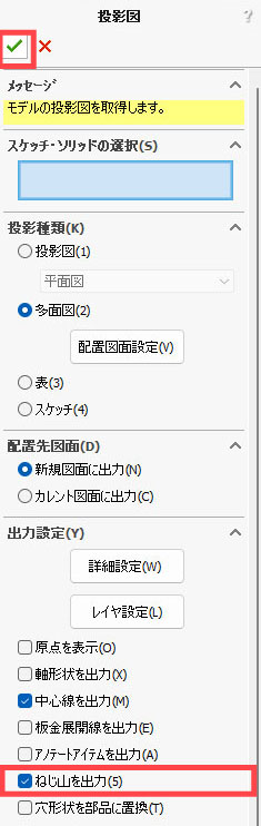 ねじ山は投影図に出力できる?
