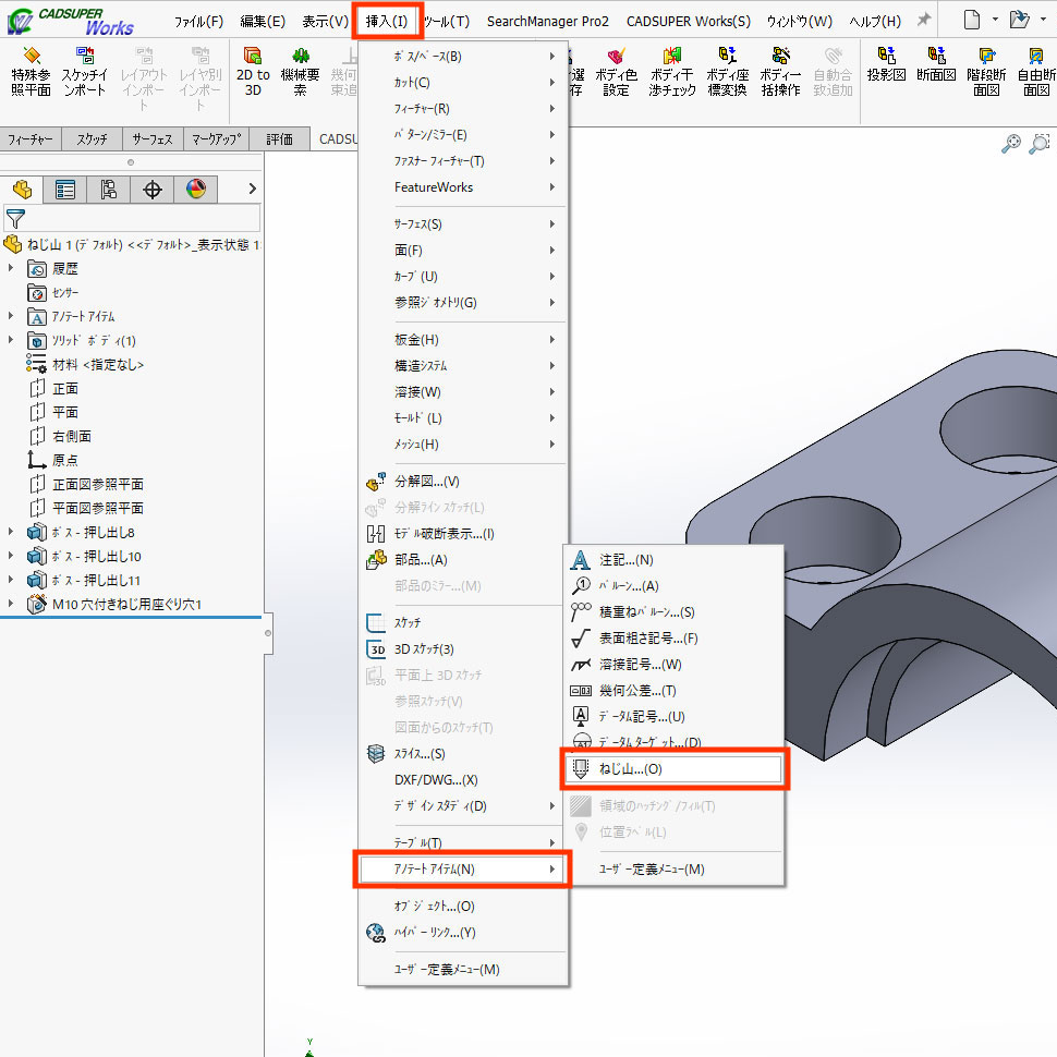 ①「挿入」メニューの「アノテアイテムーねじ山」を実行します。