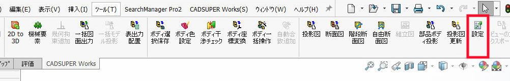 ①「CADSUPERWorks」タブの「設定」を実行します。